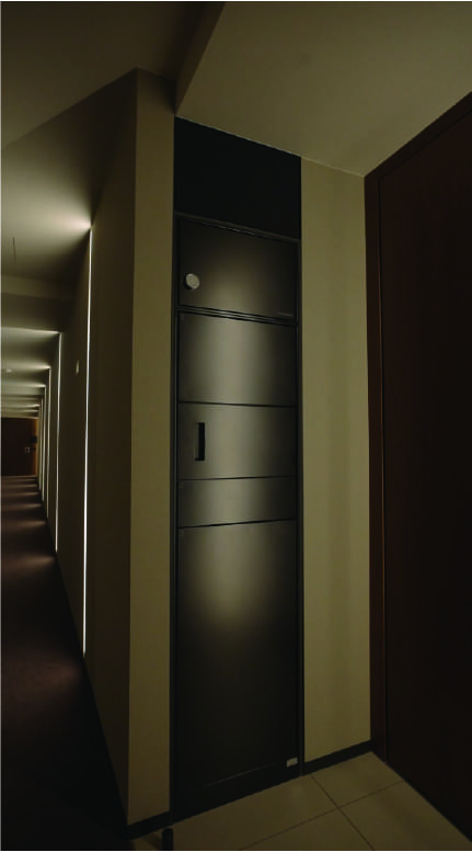 エントランスから雨に濡れることなくエスコートする内廊下、住戸前には玄関ドア一体型各戸専用宅配ボックス「ライオンズスマートボックス」を配置しています。
