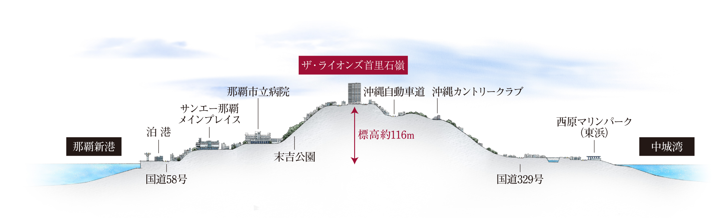 東シナ海も太平洋も視界に収めることのできる、標高約116mの丘上に立地する『THE LIONS首里石嶺』。