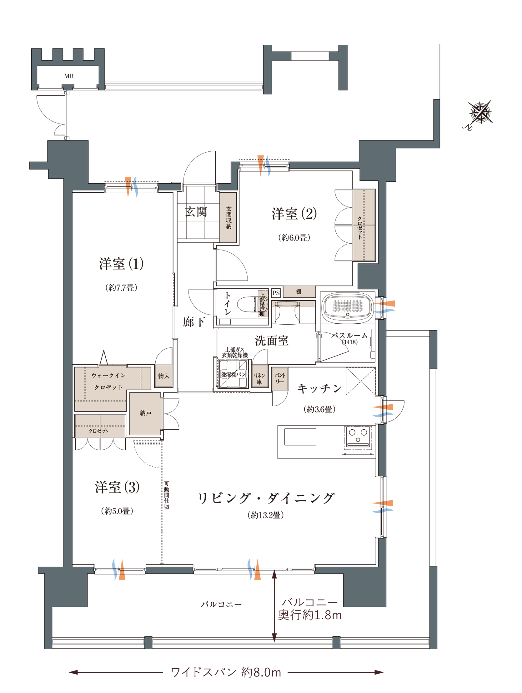 - 洋室(3)の可動間仕切壁を開放すれば約18.2畳の大空間に。