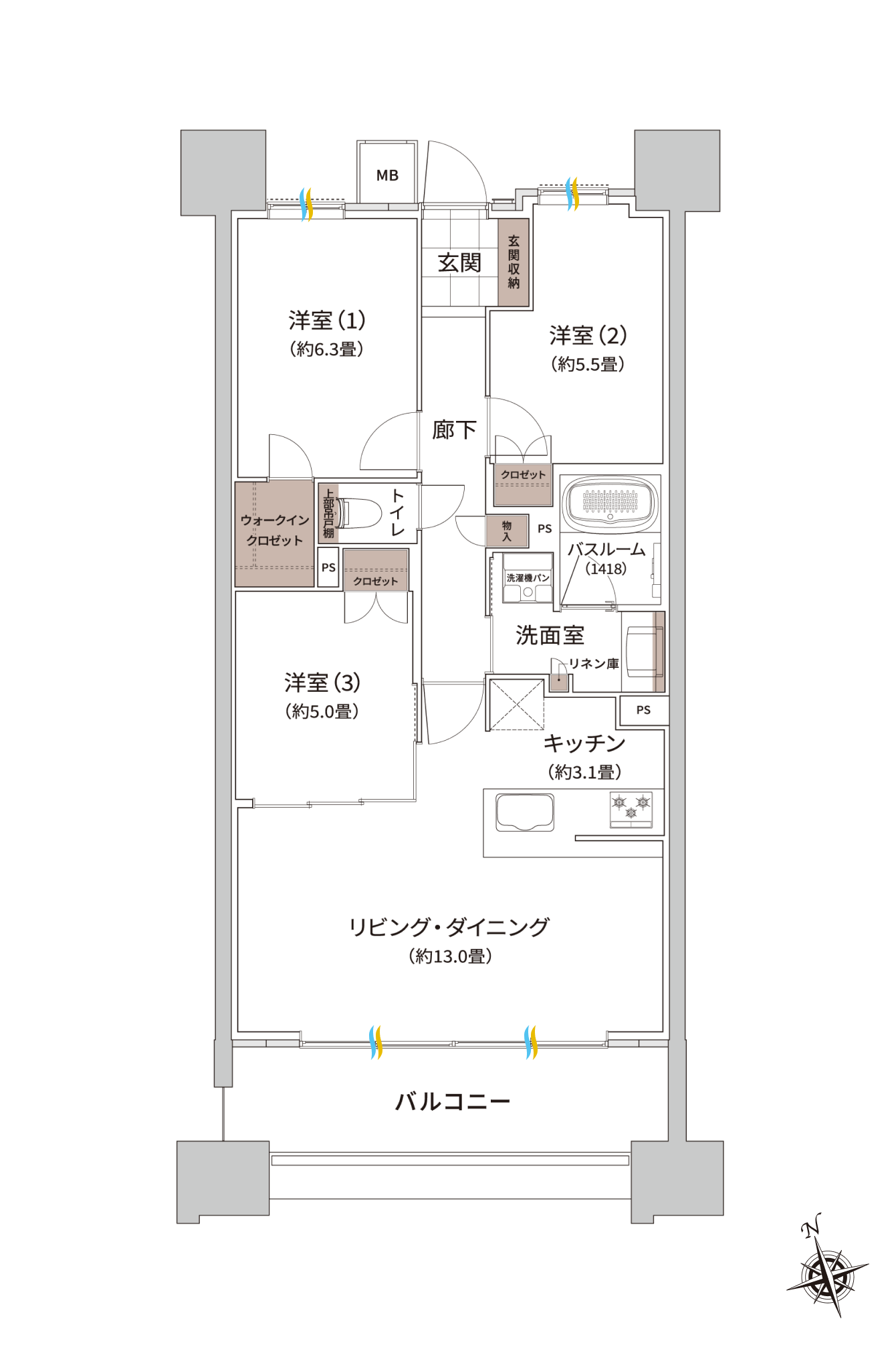 専有面積70㎡台、3LDK中心(一般分譲対象住戸185戸中94戸)